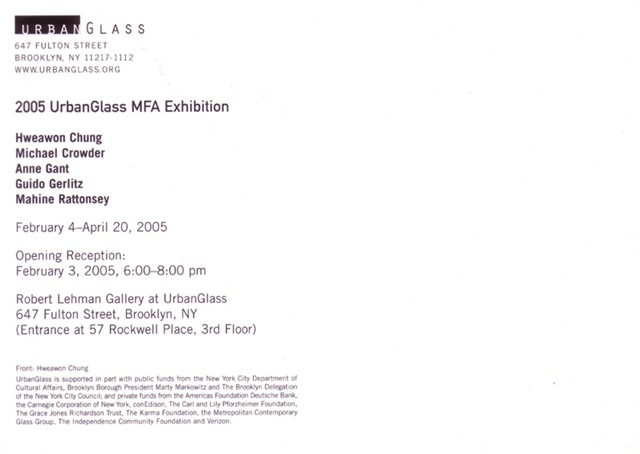 Blog Posts Urban Glass MFA – February 04 – April 20, 2005 Posted by Anne Gant on February 4, 2005March 22, 2008 Urban Glass MFA Show Installation Share this: Share on Facebook (Opens in new window) Facebook Share on X (Opens in new window) X Like Loading... Related