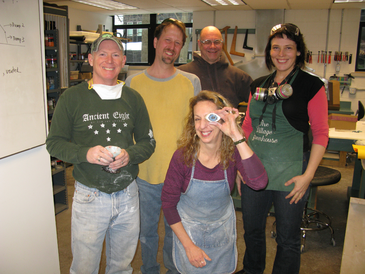 In January I went to the Studio of the Corning Museum of Glass as a teaching assistant for Anna Boothe’s class on casting and moldmaking with murrini. I’m in the green apron…